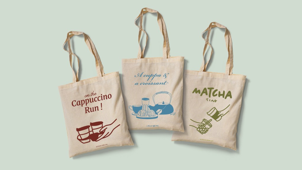 Recently rebranded from Lakes Embroidery, Branda is moving towards a more modern, premium approach to customising uniforms and merchandise. As part of their trade show presence, they wanted to create a memorable, interactive experience for visitors. The concept involved printing each guest’s coffee order onto a usable piece of merchandise, which is where I came in. I developed a side brand, Branda Coffee Club, designing three different tote styles inspired by popular coffee orders.