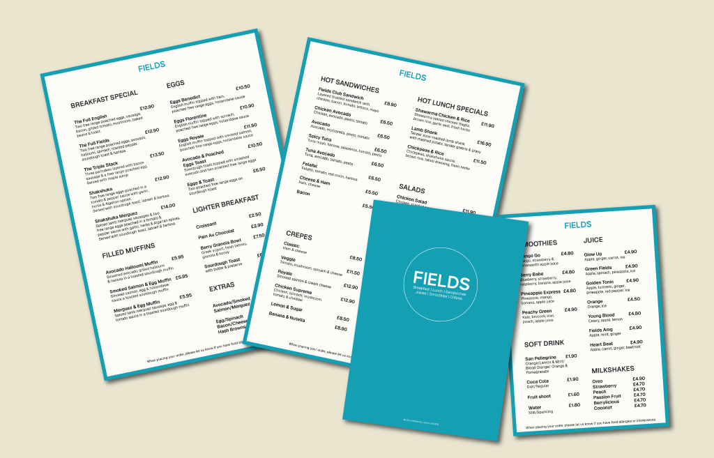I assisted Feilds Acton in the redesign of their menu. They were looking to incorporate colours that were a part of their brand’s current identity, so leaning into the teal blue, I designed a clean, simple and legible menu. The menus are printed on thick, textured card to create a high-quality feel.